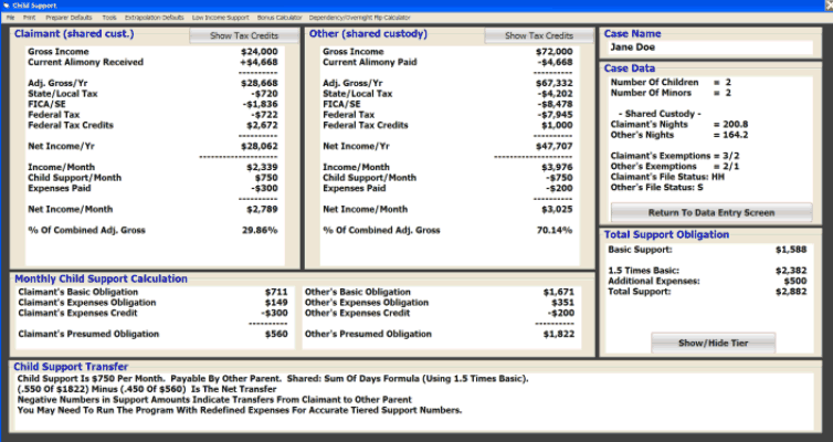 You can quickly get a child support calculation without running a worksheet. A screen shot image is shown below. You can also work directly from the worksheet if so desired. The reports generated in Support, for Maryland, will help determine which parent should take the federal tax exemptions and tax credits for their children to maximize net family incomes. You can get several types of hard copy printouts, and you can save your worksheets and data entries to a file for later use.