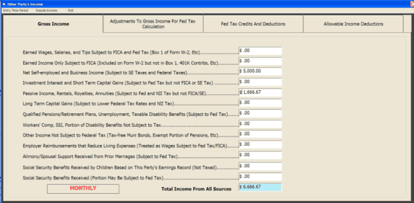 To enter a party's income and deductions for a case in Florida, you invoke a tabbed "popup" from the data entry express screen. A screen shot image is shown below. This comprehensive data entry form is used to determine each party's adjusted gross income. In generating a federal tax estimate, each party's personal exemption deductions, a standard or itemized deduction, and any self-employment tax deduction are automatically subtracted from the gross taxable incomes entered The program also automatically estimates any available child tax credits or child care tax credits and will also estimate any earned income credits if so desired. The after tax incomes of both parties is shown in the program including the tax consequences of any maintenance transfer. Incomes can be entered using various time periods, as selected.