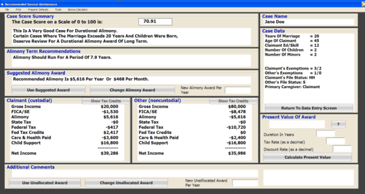 This report shows what Craig Ross, a nationally known alimony theorist, would recommend for spousal support based on the Florida guidelines and the case data that you placed on the entry express screen. A screen shot image is shown below. Also get an unallocated transfer recommendation. Easily see the tax estimates and net incomes resulting from the transfer. Additionally, Support, for Florida, will give the present value of the recommended award. To learn more about the alimony theories developed by Craig Ross follow the link at the Theory & Writings page of this web site.
