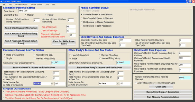 When you first start the program for Florida, you will find the Data Entry Express Screen. A screen shot image is shown below. This form leads you to other sections of the program. You can either enter case data here, or go directly to the child support worksheet. The program does extensive data checking and will warn you if some data is missing or seems incorrect. |