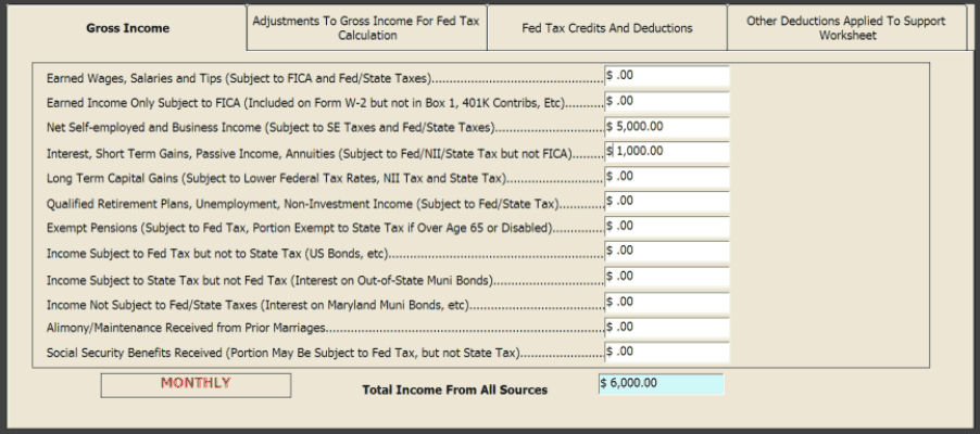 To enter a party's income and deductions for a case in Maryland, you invoke a tabbed "popup" from the data entry express screen. A screen shot image is shown below. This comprehensive data entry form is used to determine each party's adjusted gross income. To generate a federal tax estimate, a standard or itemized deduction, and any personal exemption deductions, and any self-employment tax deduction are automatically subtracted from the gross taxable incomes entered. The program also automatically estimates any available child tax credits or child care tax credits and will also estimate any earned income credits if so desired. The after tax income of both parties is shown in the program including the tax consequences of any alimony transfer. Incomes can be entered using various time periods, as selected. |