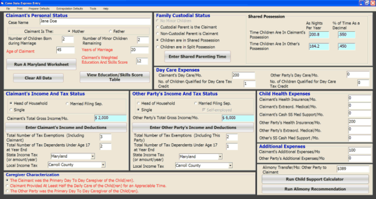 When you first start the program for Maryland, you will find the Data Entry Express Screen. A screen shot image is shown below. This form leads you to other sections of the program. You can either enter case data here, or go directly to the child support worksheet. The program does extensive data checking and will warn you if some data is missing or seems incorrect. |