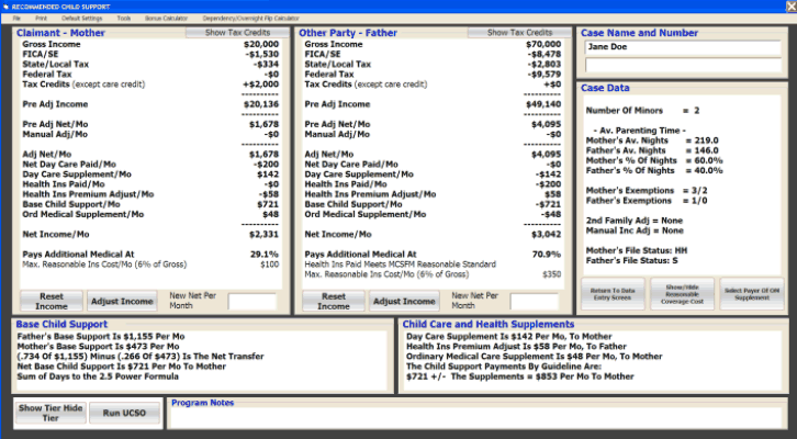 You can quickly get a child support calculation without tedious hand calculations. A screen shot image is shown below. The reports generated in Support, for Michigan, will help determine which parent should take the federal tax exemptions and tax credits for their children to maximize net family incomes. You can get several types of hard copy printouts, and you can save data entries to a file for later use. |