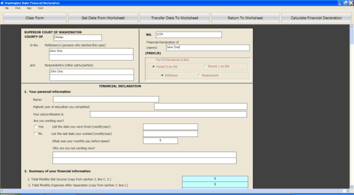 Support, for Washington, also includes a feature for completing the Financial Declaration form. A screen shot image is shown below. Case data can be transferred back and forth between the Child Support Worksheet and the Financial Declaration, and calculations are automatic. |