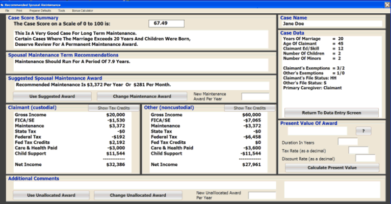 This report shows what Craig Ross, a nationally known alimony theorist, would recommend for spousal maintenance based on the Washington guidelines and the case data that you placed on the entry express screen. A screen shot image is shown below. Also get an unallocated transfer recommendation. Easily see the tax estimates and net incomes resulting from the transfer. Additionally, Support will give the present value of the recommended award. To learn more about the alimony theories developed by Craig Ross follow the link at the Theory & Writings page of this web site. |